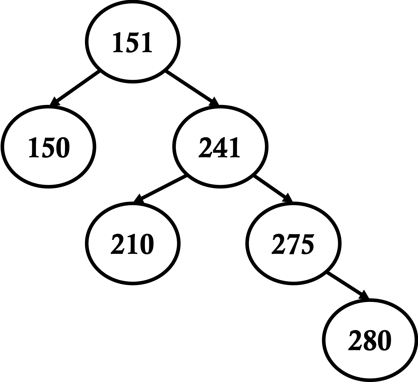 - pre-order traversal: 151, 150, 241, 210, 275, 280