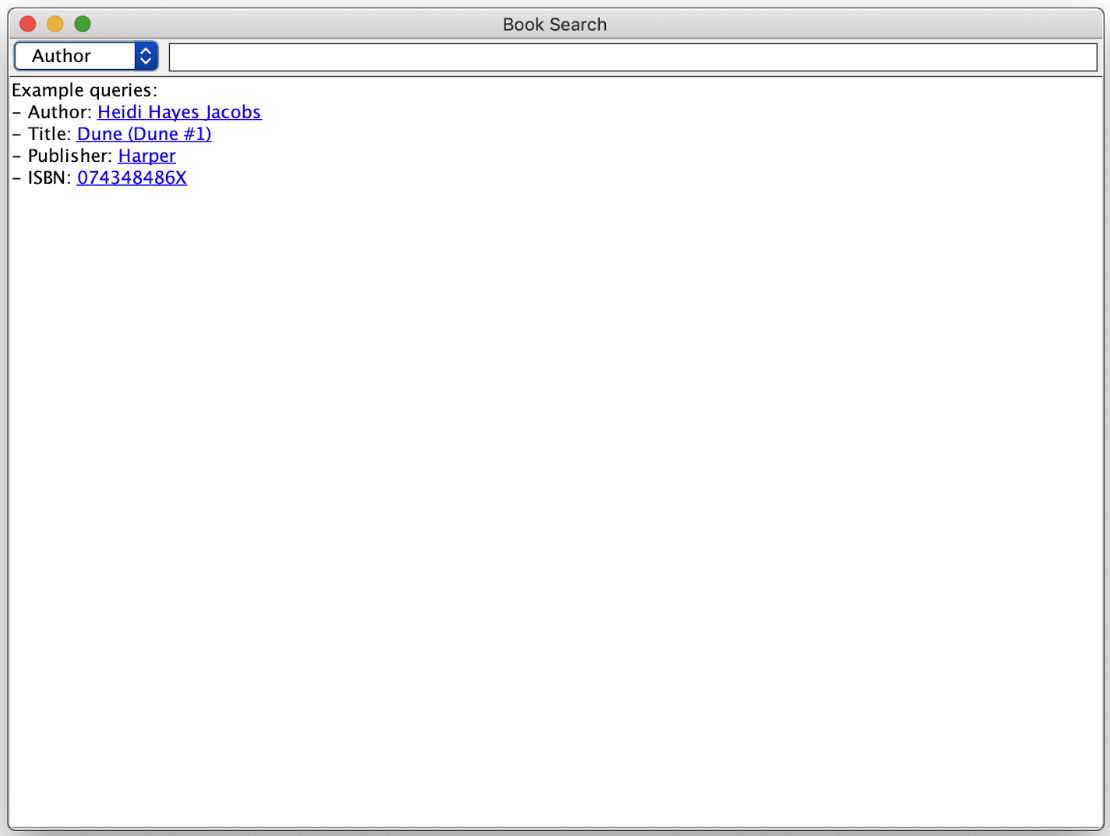 A GUI for our search engine has been provided for you in the BookSearchFrame class. If you run the main method in this class, you will see something like the following image: